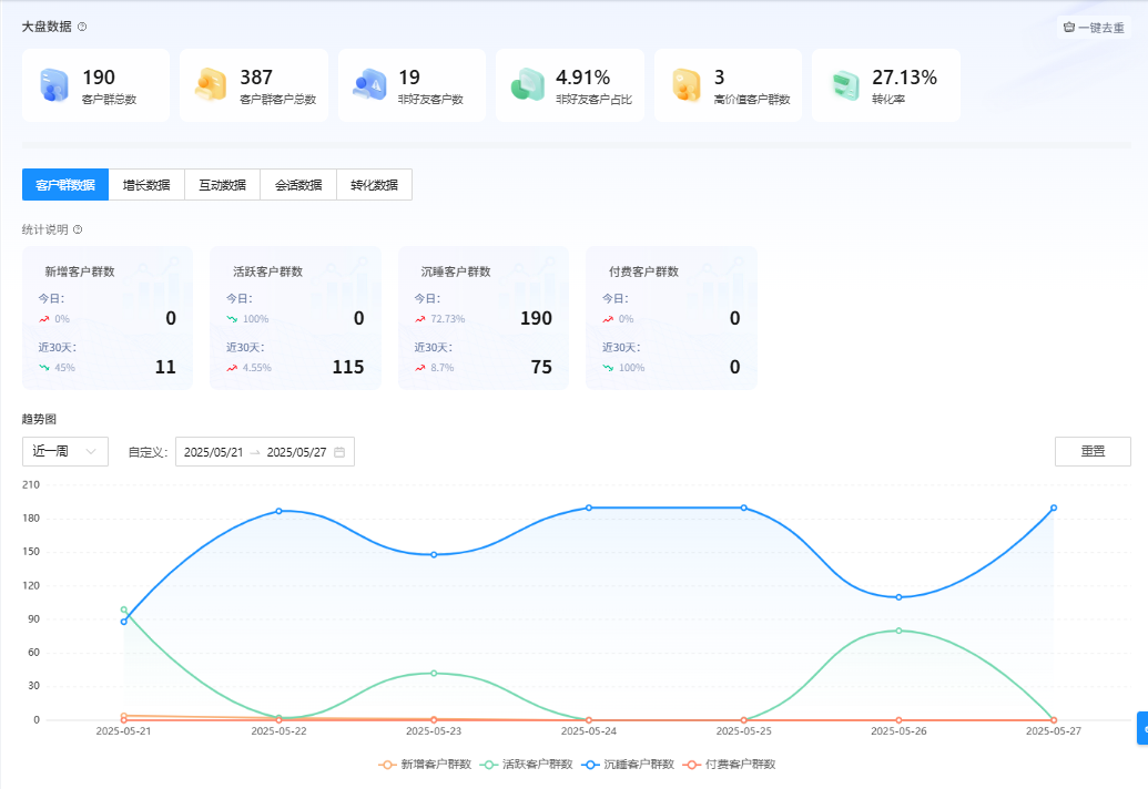 想象一下这样的场景:当你打开后台的一刻,所有运营数据都清晰呈现——客户增长趋势、互动转化效果、群聊活跃度、高价值客户分布……所有关键指标一目了然,运营全局尽在掌握。
