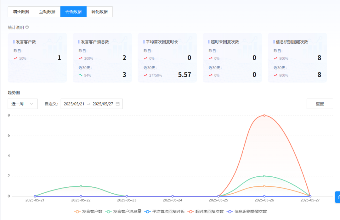 想知道客服团队表现如何?通过全面的会话数据分析,你可以清晰了解发言客户数量、监控平均首次回复时长、追踪超时未回复次数等关键服务指标,从而精准优化客服响应策略,持续提升整体服务质量。