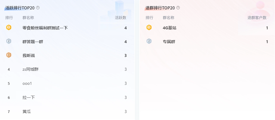 特别是活跃群排行TOP20和退群排行TOP20,能直观展示哪些群最受欢迎,哪些群正在流失用户,方便及时调整群运营策略,挽回流失客户。