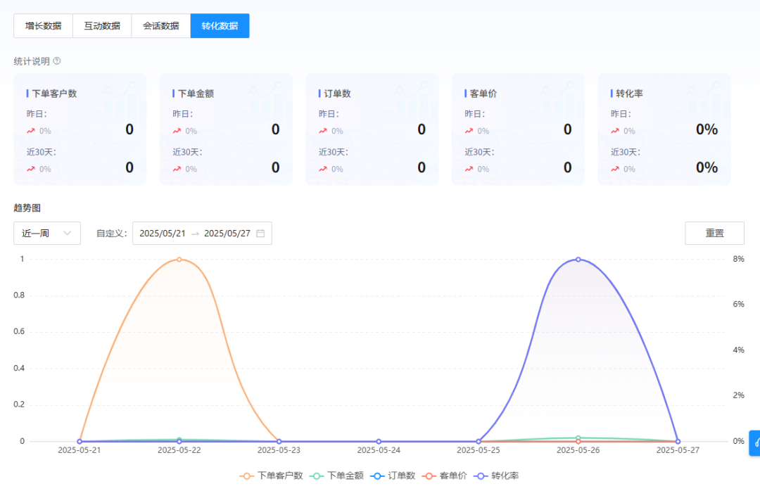 除了客户和客户群概况、互动数据、会话数据的分析,「运营数据洞察」还为你构建了一个清晰完整的销售全景图:下单客户数、下单金额、订单数、客单价、转化率等核心销售指标,全部都一目了然地呈现。