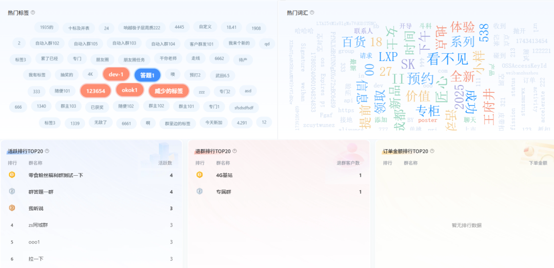 从个体维度洞察客户行为,到群体维度把握社群动态;从动态折线图展示数据变化,到精准TOP榜单锁定关键指标,为企业提供了全方位的数据视角,让每一个运营决策都建立在扎实的数据基础之上。