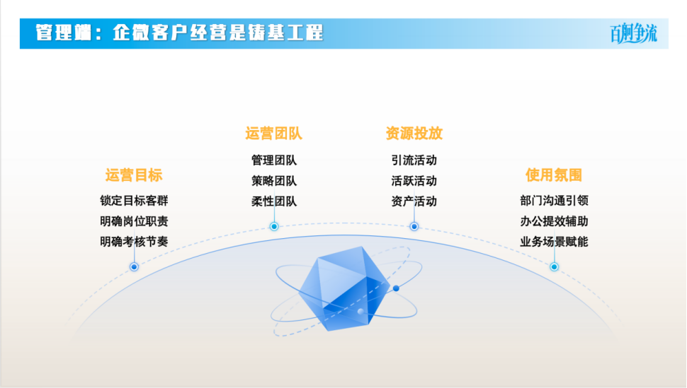 1.管理层躬身入局:企微客户经营是铸基工程,顶层设计十分关键。相对于传统的工作推动不同,总行/一级分行既是顶层设计的舵手,又是工作推动的教练,理解企微客户经营的底层逻辑,方能做好工作推动。