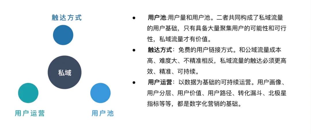 用户池是私域流量的基础,包括用户池的建立,用户的引入,用户的留存。用户池的选择有个人微信号,企业微信,微信服务号, APP是现在最常用的思域用户池,运营难度依次增加,但同时用户的农村效果也逐层递增。用户的引入是一个持续而艰难的工作,需要公司想尽一切可能,在用户使用中植入添加微信、关注服务号、下载APP的场景,最大程度的实现用户的留存。电商的包裹卡,好评短信,产品二维码,线下门店的客流扫码,送购物袋扫码,入会扫码,门店顾问扫码,各种形式的用户引用都不为过。用户的留存和用户的引入是同时发生的,我们以何种方式引入用户就必须给予用户符合预期的留存手段。比如,电商包裹卡内常用的手段是扫码参与抽奖、好评返现等,用户扫码之后完成评价,领取了红包,对用户来讲,他整个使用场景已经结束,自然会出现大量的取关删粉现象,因此在我们涉及用户引入手段是就必须考虑到流程的持续性。再比如,你是一家卖服装的企业,我们可以将好评返现改成搭配服务,用户只需拍照给我们就可以获得一份量身定制的着装推荐,帮助用户利用我们的服装,搭出最适合自己的风格。如果,每个月或者每个季度,我们都可以为用户免费的提供一次穿搭建议,那这样的留存效果就会更持续。甚至一些高端服饰,我们可以定期赠送定制的保养服务,让企业微信/个人微信变成用户的“刚需”。每个公司因为现在的业务状态不一样,对私域用户制的建立,也应该采取不同的策略。如果,公司的用户数量和研发能力并不强,还是建议大家使用个人微信号或者企业微信号,好处是简单方便,成本低且用户接受起来比较容易,坏处自然是功能过于简单,只能满足基础的需求。但是,个人微信号有存在因过度营销而被封号的可能,较企业微信而言,个人号的风险更大一些,且企业微信作为官方推荐的私域运营工具,在群发的便捷性、内容素材的多样性和营销的效果统计上具备更好的体验。我们甚至可以根据用户的个性化标签进行精准触达,这部分内容后面我们将继续讲,因此企业微信已经成为现在最受欢迎的思域流量运营工具。个人微信的触达方式主要是手动群发和朋友圈,但是受制于群发人数的上限以及朋友圈限流展示的规定,很多个人号虽然每天狂发几十条朋友圈,但真正在用户端被显示出来的很可能为0,原因就是因为低质量、高频次的朋友圈素材,已经让你被系统判定为”营销小号“,你的朋友圈已经不再对用户进行展示,所以有时候朋友圈效果不好,并不能完全归咎于设计师和文案,还有一种可能这是你的朋友圈可能已经很久没有“被看见了”。因此还是想重点推荐一下使用个人号的朋友可以尽快的转到企业微信号上去,尤其是账号多,用户广的企业,没等到个人号被封禁才后悔大把的用户,白白浪费了。不过,通过服务号的推文和模板消息,APP的推送功能,可以更高效的实现用户触达且内容的形式和时间频次要求会更自由一些。当然除了这些用户群工具自带的复杂方式之外, AI电话、智能短信、线下导购、线上客服都是非常重要的触达手段,对于企业,研发和创新能力都是持续增长的基础,在公司的发展中一定要更留心市场上媒介的变化方式才能是自己处于不被淘汰的状态。同时,现在占据用户大量时间的抖音快手小红书b站,我们也需要通过合适的内容去覆盖目标人群,使用户在碎片化的时间里,仍然可以接触到我们的品牌或产品,内容平台的曝光,也是非常重要的触达方式,占领用户的心却是所有品牌的最终极目标。数字化运营是一个更加复杂的过程,在之前的文章中我有介绍过四种私域流量运营的方法论,大家可以参照文章中的要点寻找适合自己的模式《10分钟讲清“私域流量”的4种模型,可复制的运营操盘术》。选择业务模式之后就是在尽可能多的场景中沉淀用户数据,形成公司的数据闭环,使得一个个分散的个体用户成为具备共同性的用户画像从而对我们进行用户服务,用户营销以及新产品的研发,都带来巨大的帮助。用户的转化率是判断运营效果的最好指标,只有当用户接受了你的产品或服务,才能证明你的营销具备价值,否则任何形式的私域、公域触达都只是骚扰。显然,数字化运营就是私域流量运营中三体问题的最不确定因素,营销效果的好坏,直接影响到触达方式的有效性评估,同时,评估结果又指导触达的手段的改进,触达内容的优化升级,数据化运营既是触达手段的结果,也是触达手段动力。而我们用户池的大小,又和触达方式、数字化运营质量有着不可分割的关系;触达方式合适,用户的留存就会好;运营的数字化程度高,精准性强,用户就不会被过度骚扰,更有助于用户池的壮大。所以无论是何种形式的结构,都需要三者之间进行动态的协作,从而实现业务水平的螺旋式上升,添加用户微信只是运营的第一步,也是最简单的一步。