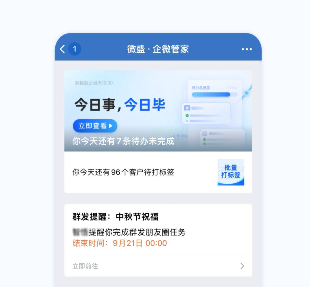 对于很多物业企业来说,想做好员工管理、客户服务依赖的是“人”:人对人的管理能力、人对客户的服务能力。个人能力的差异化,很容易导致业主体验的参差。举个例子,绿城服务交付的新项目内,所有的室内设施都有独立的质保时间。在质保到期前,绿城服务一般会通知业主进行问题报修,因为一旦错过上报时间,后续的设备问题就需要自费维修。但这一环节,经常出现纠纷与争议:有的时候管家说发送了,但业主说没收到通知。而管理者只能靠抽检手机,管家自己上报来检查、核实服务情况。为了减少这些“人”所产生的不确定性,绿城服务通过微盛·企微管家的「任务体系」构建了“服务质量管控系统”。管理者可以在微盛·企微管家后台提前建立好模板、编辑好内容,然后统一将任务下发给管家。管家在收到“协作任务”后,只需点一下,就可以保质保量的完成私聊、群发、朋友圈的推送。