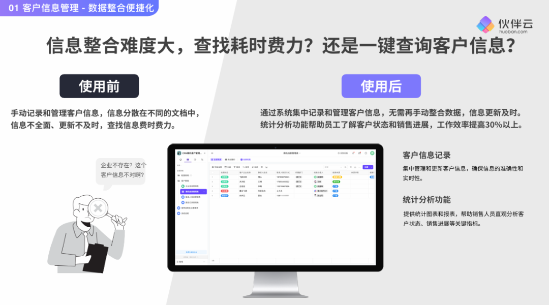 开头我们聊到,ToC的生意只要和一个消费者打交道,ToB销售往往需要对接多个决策角色。使用者、采购负责人、技术把关人、财务审批人,甚至老板的“老板”……每个人都有自己的需求和顾虑,稍有不慎就会卡在其中一环节。所以ToB销售想要成交,建立一个“作战地图”特别有必要。上面除了要有企业背景资料,还应该尽可能记录每个决策者的背景、沟通记录和关键需求,建立完整的客户画像,才能避免信息遗漏和沟通断层。伙伴云CRM系统的客户分析看板