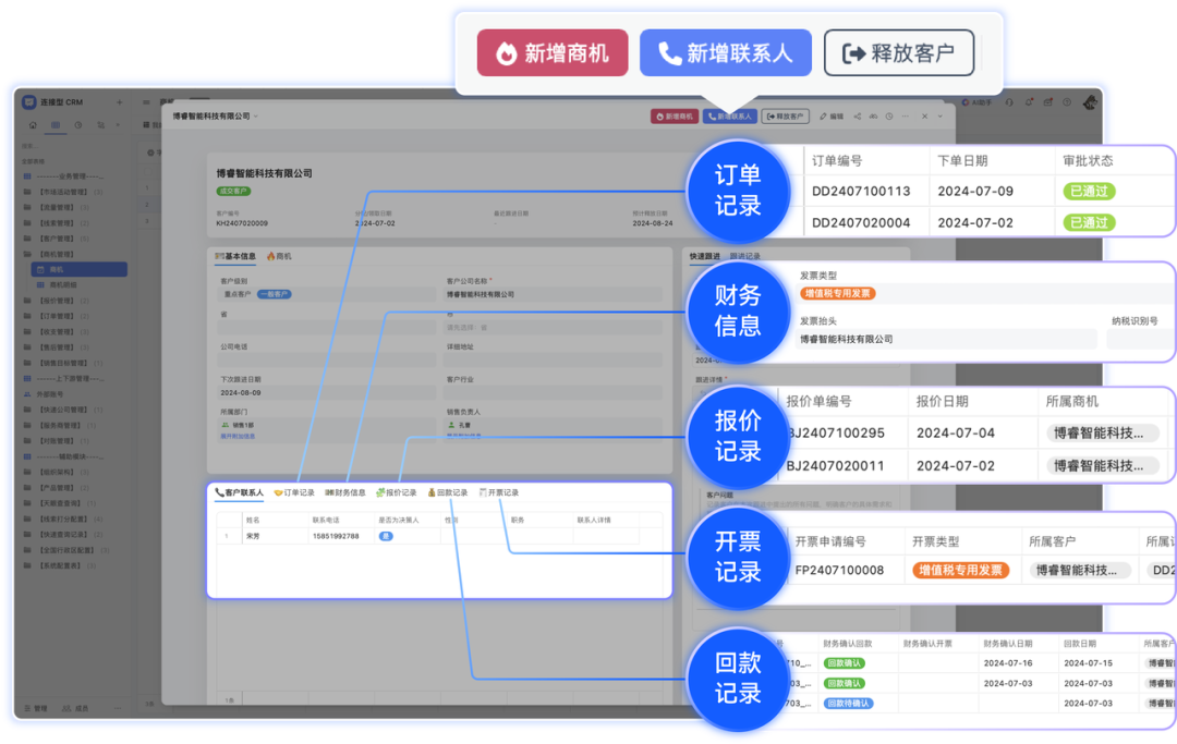 有个销售跟我吐槽过,自己找不到新客户,更别提开单,这个月又只能拿保底工资了。我就问他,有没有多和老客户联系,让他们给介绍一些新客源。其实这也是ToB跟ToC不一样的特点。不仅老客户本身存在续约、增购的可能性,而且他们身边有很多同行,可能也有一样的需求,指不定哪天人家就把这些同行介绍给你了。如果好好经营和老客户的关系,这些收益加起来占比甚至能超过50%。CRM系统能自动提醒你进行定期回访,记录服务历史,让客户感受到“被重视”。